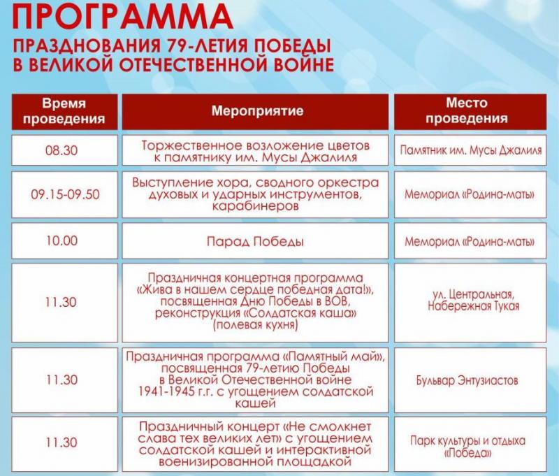 Исполком Набережных Челнов обнародовал программу мероприятий, приуроченных к празднованию 79-ой годовщины со Дня Победы в Великой Отечественной войне.