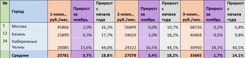 В силу ноябрьского скачка Челны вышли на второе место и по динамике роста арендных цен с начала года. Так, с января по ноябрь включительно сильнее всего найм жилья подорожал в Кирове (+45%, +47,6% и +84%), а в Челнах рост составил +44%, +44,1% и +40,5% в зависимости от количества комнат.