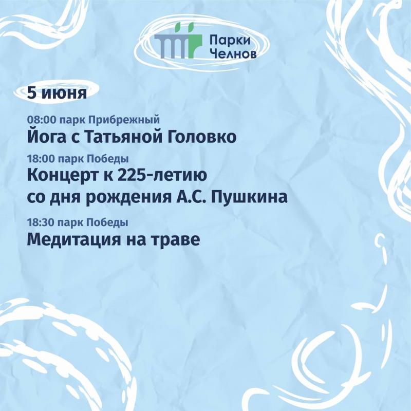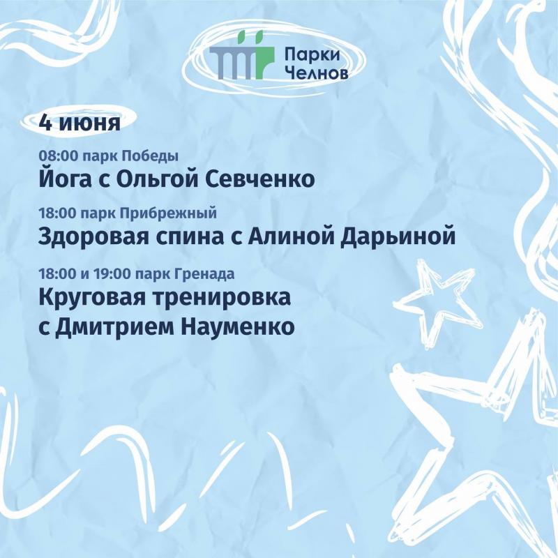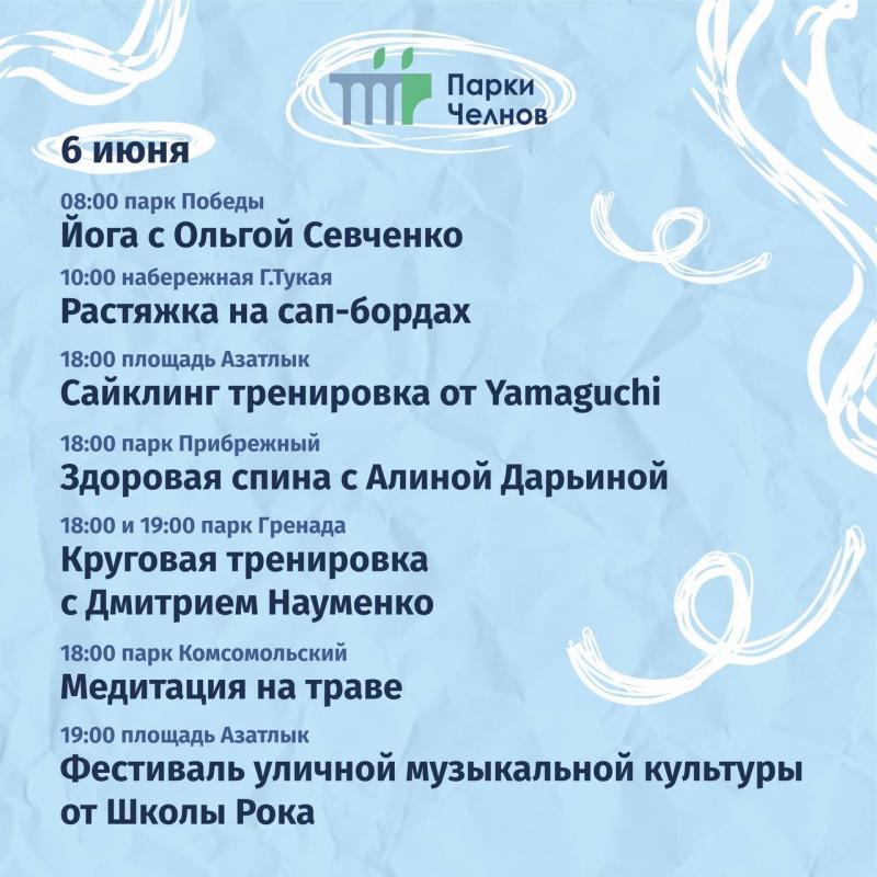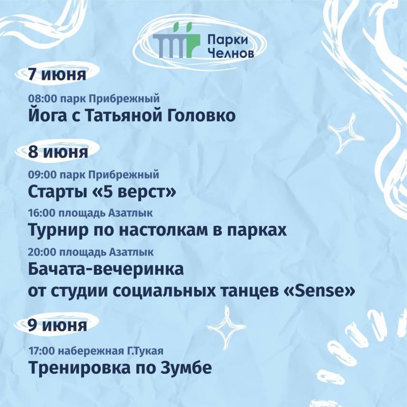 Команда «Парки Набережных Челнов» анонсировала публичные мероприятия, которые пройдут на территориях городских парков, бульваров и набережных на этой неделе.