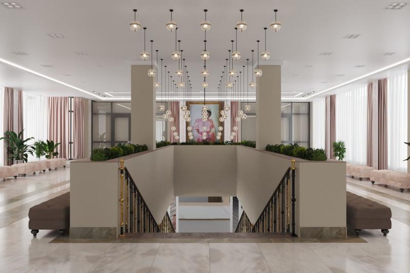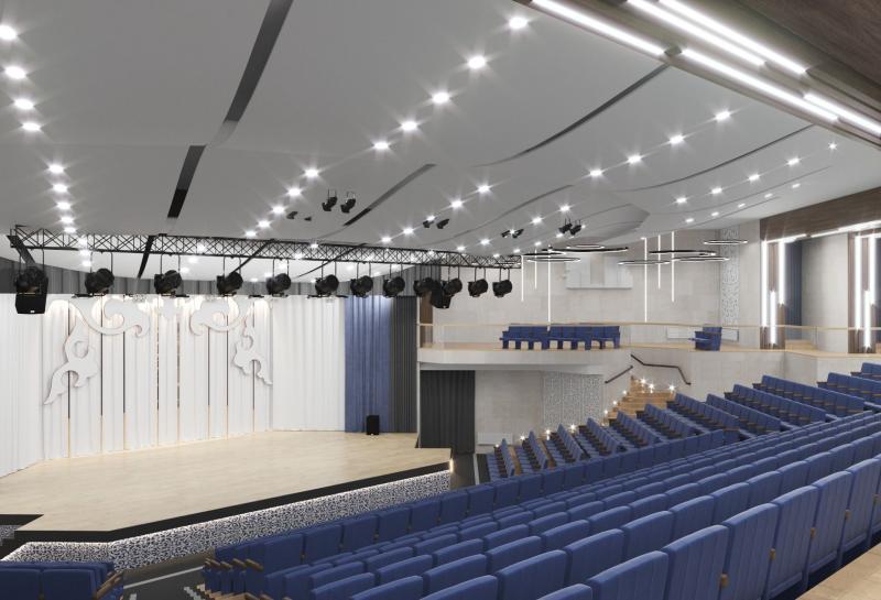 Как следует из документов, концепция дизайн-проекта, которой подрядчику предстоит следовать, была разработана еще в 2021 году к ремонту собственно помещений мэрии Набережных Челнов. К настоящему времени проект частично исполнен: проект содержит рендеры как концертного зала, так и всех четырех этажей здания исполкома, уже обновленных согласно представленным эскизам – в частности, зала заседаний горсовета, коридоров мэрии и других помещений. Разработкой занималась челнинская дизайн-студия «РА». Пространства концертного зала в рендерах студии оформлены в двух цветах на выбор и выглядят так:
