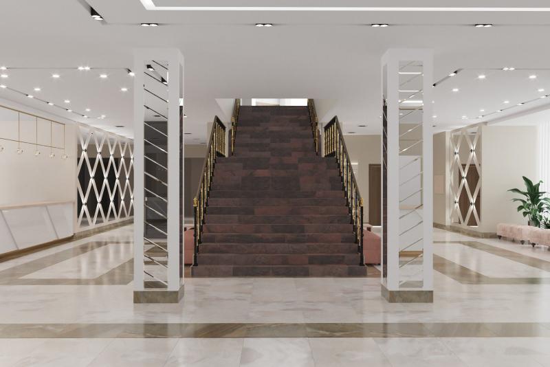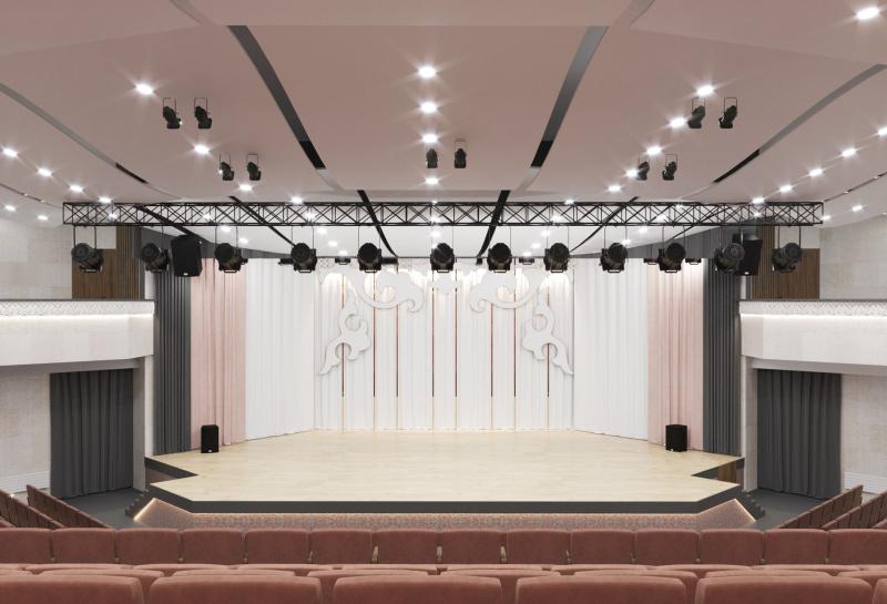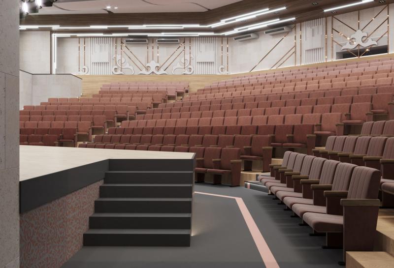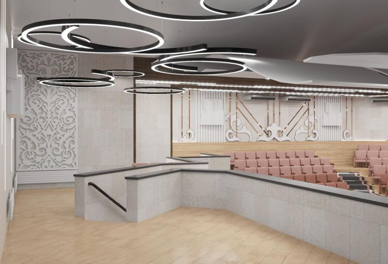 Как следует из документов, концепция дизайн-проекта, которой подрядчику предстоит следовать, была разработана еще в 2021 году к ремонту собственно помещений мэрии Набережных Челнов. К настоящему времени проект частично исполнен: проект содержит рендеры как концертного зала, так и всех четырех этажей здания исполкома, уже обновленных согласно представленным эскизам – в частности, зала заседаний горсовета, коридоров мэрии и других помещений. Разработкой занималась челнинская дизайн-студия «РА». Пространства концертного зала в рендерах студии оформлены в двух цветах на выбор и выглядят так:
