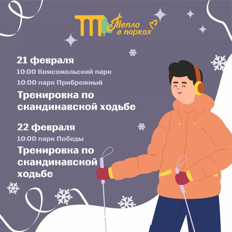 Традиционно в 10.00 в среду и четверг, 21-22 февраля, в Комсомольском парке и парке Победы пройдет тренировка по скандинавской ходьбе.