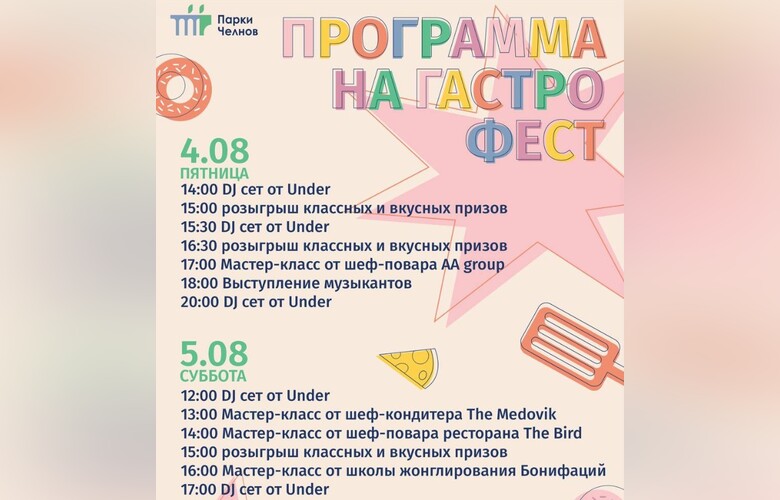 В конце недели, 4 и 5 августа, на площади Азатлык пройдет гастрономический фестиваль. Мероприятие анонсировали «Парки Набережных Челнов» в своем telegram-канале. Вход на фестиваль свободный.