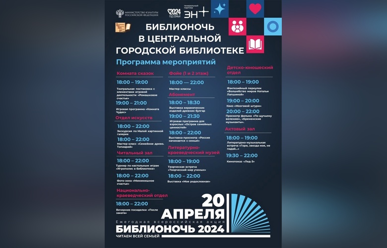 «Библионочь» пройдет под титульной темой «Читаем всей семьей». Посетители смогут стать зрителями детской театральной постановки или участниками игровой программы, смогут ознакомиться с экспонатами малой картинной галереей. Из фильмов в программе вечера свежие отечественные картины для всей семьи: «По щучьему велению», «Бременские музыканты» и «Лед-3». Полная программа «Библионочи» отражена в афише:
