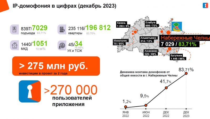 По словам директора набережночелнинского ЗУЭС Максима Степанова, автоград в несколько раз опережает столицу Татарстана по числу IP-домофонов в жилых подъездах. Если в Набережных Челнах на сегодня установлены 7029 домофонных панелей, то в Казани их насчитывается 1263 штуки. Челны в этом смысле лидируют среди всех муниципалитетов республики. За два года оператор программы «Таттелеком» вложил в этот проект свыше 275 млн рублей.