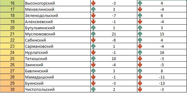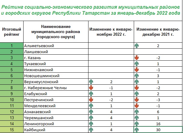 В общем рейтинге первое место занял Альметьевский район. Второе место досталось Лаишевскому муниципалитету. Тройку замкнула Казань. В пятерку также вошли Тукаевский и Нижнекамские районы.