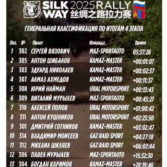 Победу же на четвертом этапе, проложенном между Улан-Удэ и Улан-Батором, одержал экипаж «КАМАЗ-мастер» под управлением Дмитрия Сотникова. Действующий победитель ралли опередил Вязовича на 6 минут и 20 секунд, показав лучшее время на спецучастке.