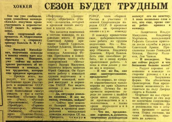 А что же стало дальше с хоккейной командой из Набережных Челнов? Известно, что в 1974 году она сменила своё название на «КАМАЗ». Внизу интервью с Гусевым Виталием Михайловичем – страшим тренером команды, опубликованное в газете «Рабочий КАМАЗа» от 17 августа 1974 года.