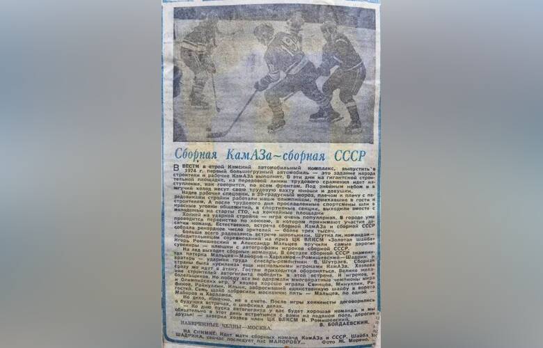 И в январе 1973 года в Набережных Челнах, на хоккейной площадке возле кинотеатра «Гренада» состоялся исторический матч со сборной СССР по хоккею, в составе которой выступали легенды советского хоккея – Борис Майоров, Александр Мальцев, Валерий Харламов, Владимир Шадрин, Игорь Ромишевский и другие. Вот как об этом мачте сообщалось в одной из газет того времени.