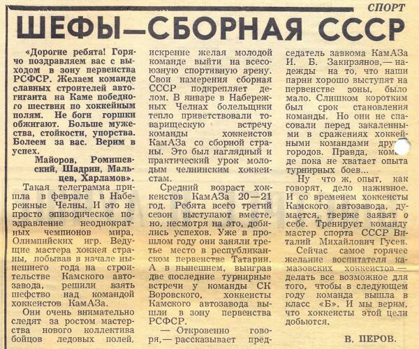 И ничего, что камазовцы проиграли со счётом 1:7. Сборная СССР по хоккею стали шефствовать над хоккейной командой из Набережных Челнов. Вот какое поздравление от шефов по случаю выхода ХК «Торпедо» в зону первенства РСФСР было опубликовано в газете «Социалистическая Индустрия на строительстве Камского автозавода» от 22 февраля 1973 года.