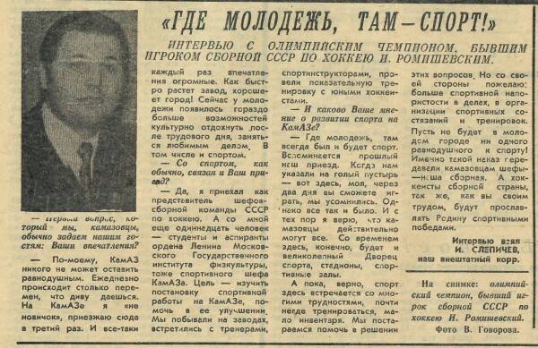 Неизвестно, до какого года продолжалось шефство сборной СССР по хоккею над камазовской командой. Но ещё в 1975 году Игорь Ромишевский – уже бывший игрок сборной СССР по хоккею, член ЦК ВЛКСМ в качестве шефа приезжал в Набережные Челны. Внизу его интервью газете «Рабочий КАМАЗа» от 22 февраля 1975 года.