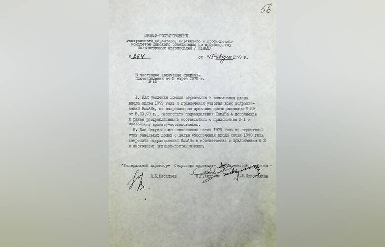 Приказ-постановление от 15 августа 1979 года рассказывает, какое то или иное камазовское подразделение было закреплено за тем или иным городским объектом.