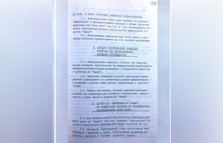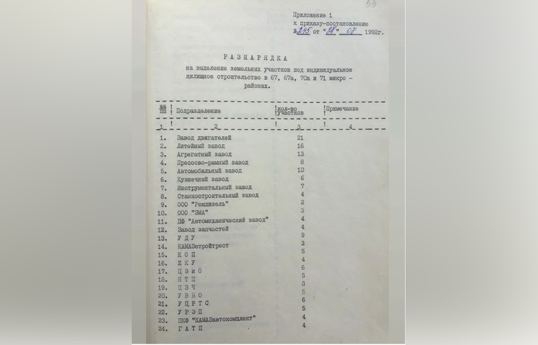 Позднее, в соответствие с постановлением №75 от 25 февраля 1992 года, за подписью Алтынбаева Рафгата Закиевича – мэра города Набережные Челны, на КАМАЗе в 1992 году выходит ряд приказов-постановлений уже о распределении земельных участков под индивидуальное строительство в 66, 67, 67А, 70А и 71 микрорайонах среди работников КАМАЗа.