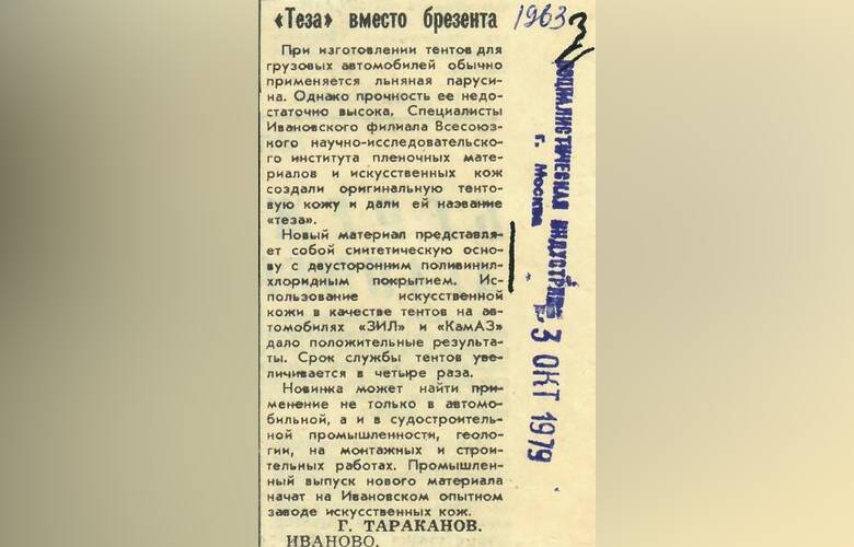 Сначала при изготовлении тентов для автомобилей КАМАЗ использовалась льняная парусина, но она была недостаточна прочна. И в 1979 году на КАМАЗе стали использовать тентовый материал под названием «Теза».