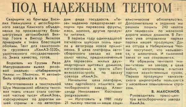 Причём, из материала, поступавшего из Ивановской области, тенты изготавливали непосредственно на автосборочном заводе. Внизу статья из газеты «Советская Татария» от 25 июня 1981 года.