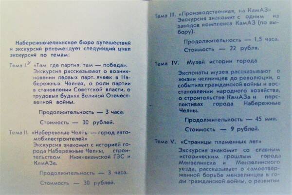Позднее, на рубеже 1970-х и 1980-х годов Набережночелнинское бюро путешествий и экскурсий предлагало вот такие маршруты.
