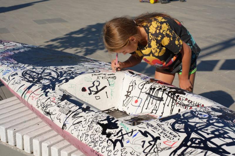 Фотозона также была оформлена кастомизированной одеждой и мерчем сообщества, а отдохнуть можно было на гамаках или импровизированных пуфах, рисуя маркером на каяке, специально привезенном для фестиваля с берега сообществом «Кораблик».