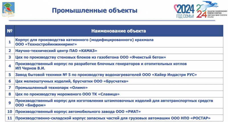 Самыми крупными коммерческими объектами, уже введенными в этом году, стали новый корпус НТЦ "КАМАЗа", предназначенный для сборки карьерных самосвалов, а также производство полиэтиленовых труб, тары, фитингов и кранов ООО «Грант».