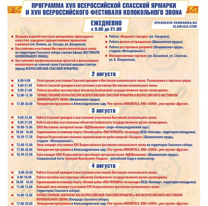 В программе ХVII Спасской ярмарки и Фестиваля колокольного звона произошли изменения. Согласно новой афише, изменилось место и время церемонии закрытия ярмарки. Оно пройдет в тот же день, но на час раньше – с 14 до 15 часов и в другом сместе – на площади Спасского собора.