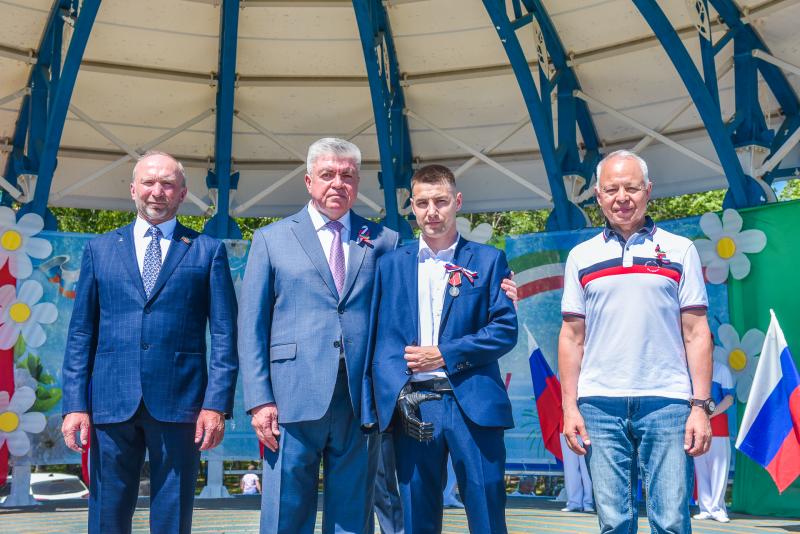 В парке Победы спикерами выступили мэр Наиль Магдеев и депутаты Госсовета РТ от "КАМАЗа" – Ильдар Шамилов и Владимир Чагин. Здесь центральным событием стало награждение 13 горожан госнаградами. Несколько медалей были переданы челнинцам, проявившим себя в боевых действиях – медаль «За храбрость» второй степени, в частности, ее обладатель Марсель Абдуллин принял протезом, заменившим его правую руку.