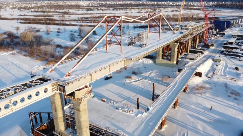 Также идет активное строительство километрового моста через Каму, он готов на 47 %. На данный момент строители уже надвинули на опоры русловой части 132 м металлической конструкции.