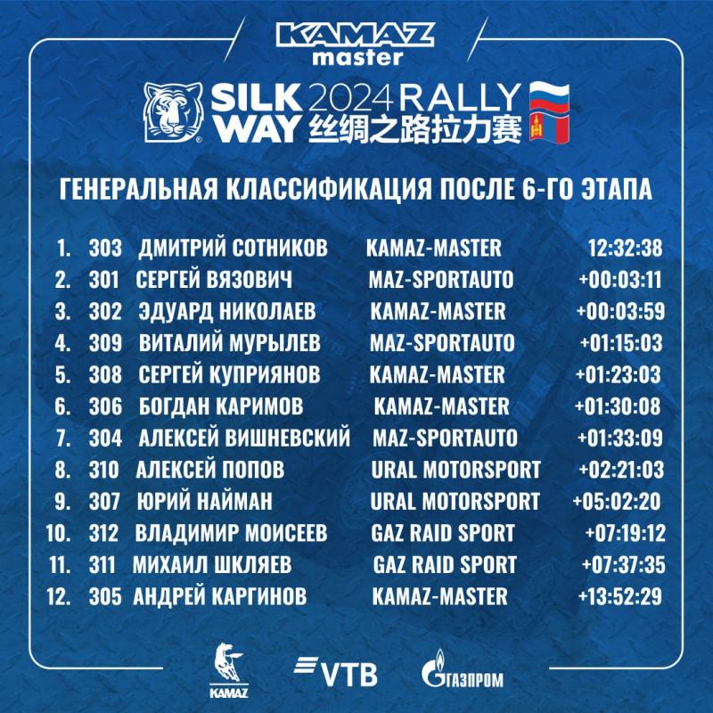 После шестого этапа ралли «Шелковый путь» первая тройка генеральной классификации грузового зачета не изменилась, однако лидер гонки Дмитрий Сотников увеличил разрыв с преследователем из команды «МАЗ СПОРТавто» Сергеем Вязовичем, а идущий третьим Эдуард Николаев, напротив, приблизил свое общее время к результату Вязовича. После сегодняшней победы Николаев отстает от Сотникова на 3 минуты 59 секунд, а Вязович – на 3 минуты и 11 секунд.
