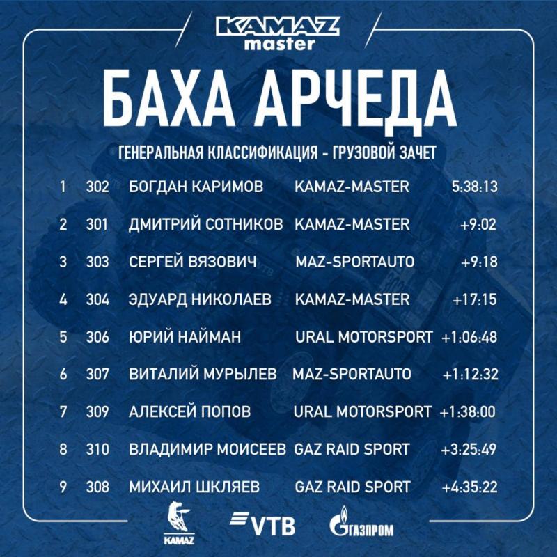 Каримов удерживал лидерство на протяжении всей гонки, вторым шел белорус Сергей Вязович. Перед заключительным этапом пилот из Набережных Челнов выигрывал у мазовца 2,5 минуты, к финишу же пришел с преимуществом в 9 минут. Более того, Вязовича на 16 секунд обошел камазовец Дмитрий Сотников, ставший в итоге вторым. Руководитель команды «КАМАЗ-мастер» Эдуард Николаев, который выступал на капотном КАМАЗе, пришел четвертым.