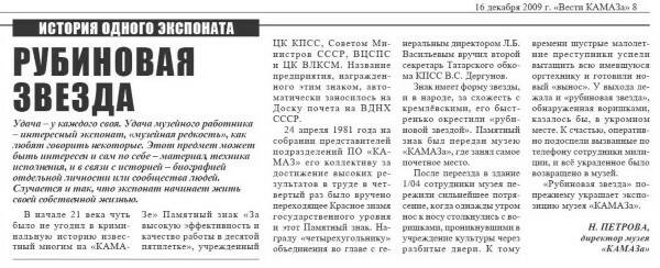 Этот памятный знак в своё время чуть было не украли из музея. Прочтите рассказ Петровой Надежды Николаевны о рубиновой звезде, опубликованный в газете «Вести КАМАЗа» от 16 декабря 2009 года.