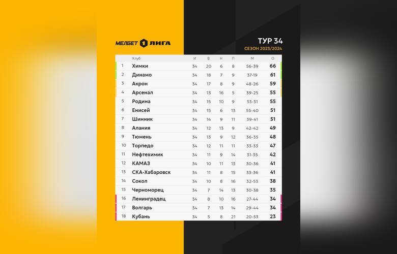 По итогам сезона покидают Первую лигу и опускаются во Вторую клубы, разместившиеся на 16-18 строчках: питерский «Ленинградец», астраханский «Волгарь» и краснодарская «Кубань». Путевки в РПЛ получили подмосковные «Химки» и махачкалинское «Динамо».
