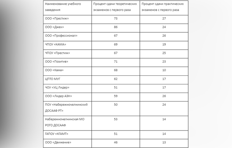 В пятерку также вошли ООО «Профессионал» (67% теория и 24% практика), ЧПОУ «КАМА» (69% теория и 19 практика), а также ЧПОУ «Престиж» (67% теория и 25% практика).