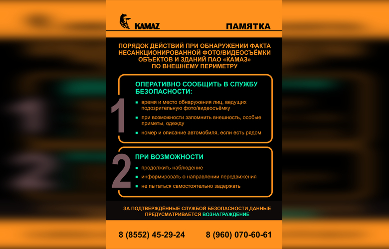 Распоряжение будет действовать до конца года. Чтобы получить награду, камазовец должен оперативно сообщить безопасникам время и место съемки, описать внешность, одежду и особые приметы человека, который ее ведет и, если рядом стоят автомобили, добавить в описание их номера, цвет, по возможности – модели. Все это нужно передать на горячую линию блока безопасности по номерам 45-29-24 или 8 960 070-60-61. Напомним, что в настоящее время запрет на фото- и видеосъемку объектов "КАМАЗа" действует не только на территории компании, но и из-за периметра.