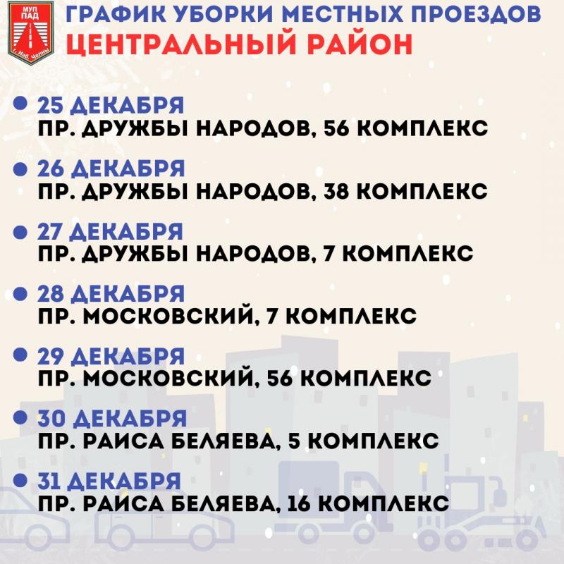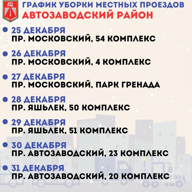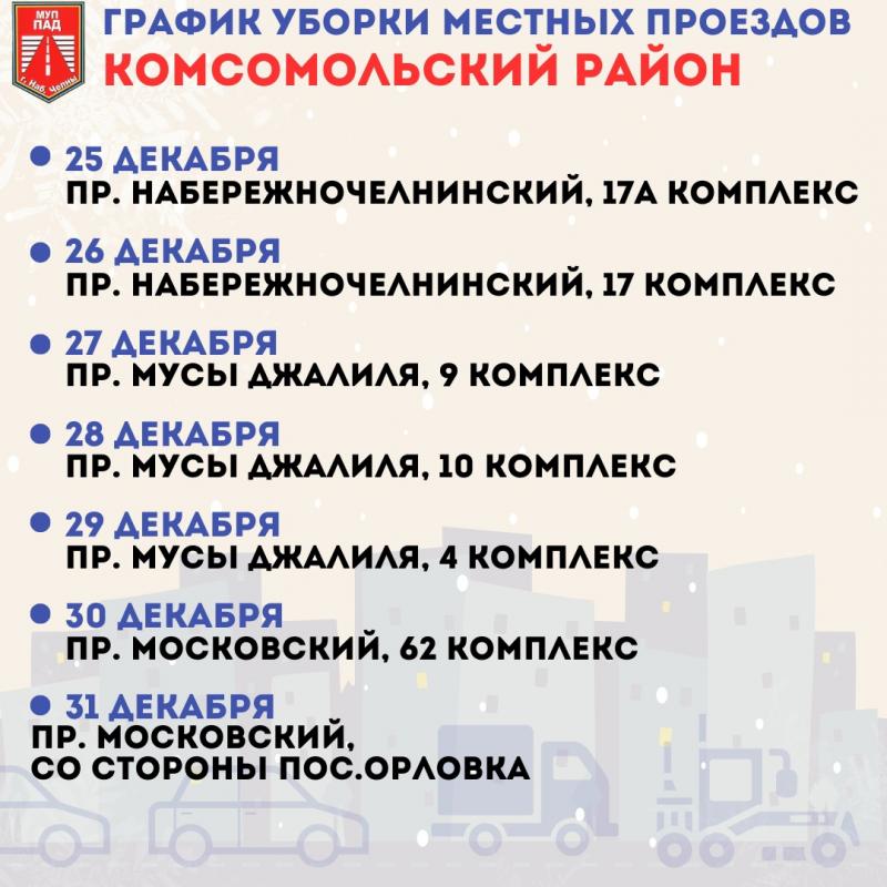 МУП «ПАД» опубликовал график уборки местных проездов с 25 по 31 декабря, с которым можно ознакомиться ниже. На выходных дорожники убрали местные проезды ул. Раскольникова, 35, 36 комплекс, пр. Набережночелнинский 32, 62 комплекс, ул. Виктора Полякова 65 комплекс и пр. Вахитова 45 комплекс.
