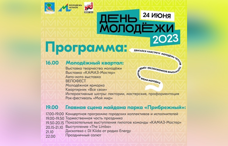 День молодежи стартует на площадке «Молодежный квартал» рядом с майданом в 16:00. Там жители и гости города смогут посетить всевозможные выставки: будет организована авто-мото экспозиция, а также выставки творчества молодежи и «КАМАЗ-Мастера»