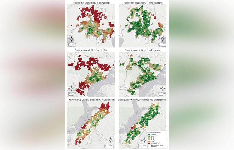 Концепция 15-минутного города снискала особый интерес урбанистов в период пандемии COVID-19, когда перемещения, особенно на транспорте, оказались ограничены. Авторы изучили на предмет 15-минутной доступности три российских города – кроме автограда объектами исследования стали Саратов и Краснодар. В этих двух городах доля населения, проживающая в пределах 15-минутного радиуса от социальной инфраструктуры, варьируется от 33 до 50%. Удобство Челнов в этом плане определяется отсутствием выраженного городского центра, в котором, как в Саратове и Краснодаре, сконцентрирована значительная часть социальных услуг.