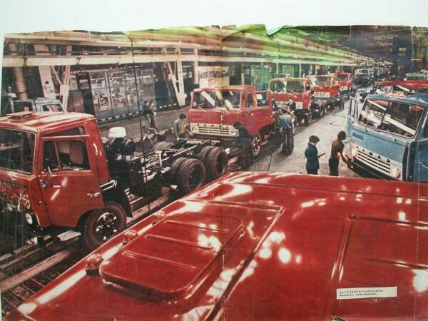 «В сентябре 1977 года на ПРЗ в пуско-наладочном режиме начала действовать линия окраски кабин - первая в цехе окраски №2. До этого события все выпущенные камазовские кабины проходили обработку по обходному варианту. Теперь же все операции - от мойки и грунтовки до покрытия эмалью – стали осуществляться по единому техпроцессу. - пишет блогер. - Основными цветами для кабин автомобилей КАМАЗ в 1970-х годах были красный (для седельных тягачей), голубой (для бортовых автомобилей), желто-оранжевый (для самосвалов)».