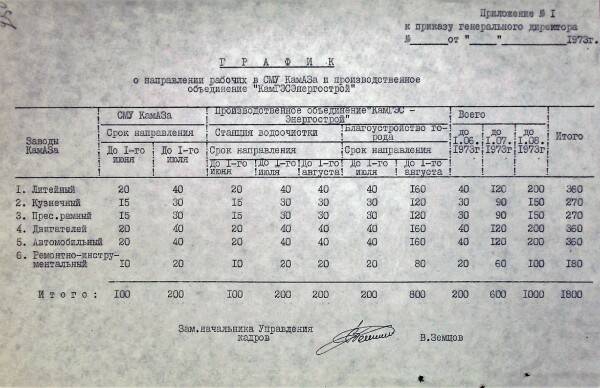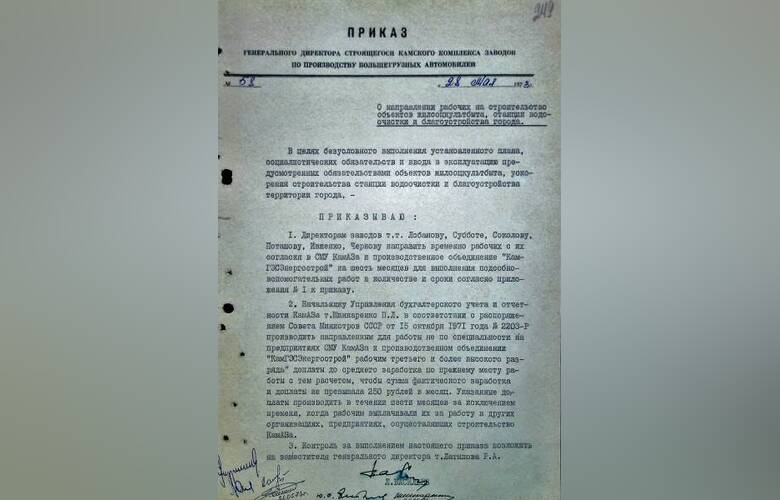 Внизу приказ генерального директора КАМАЗа от 28 мая 1973 года указывает на распоряжение Совета Министров СССР от 15 октября 1971 года, которое и послужило отправной точкой для организации работ по направлению камазовцев на строительные объекты Всесоюзной ударной комсомольской стройки.