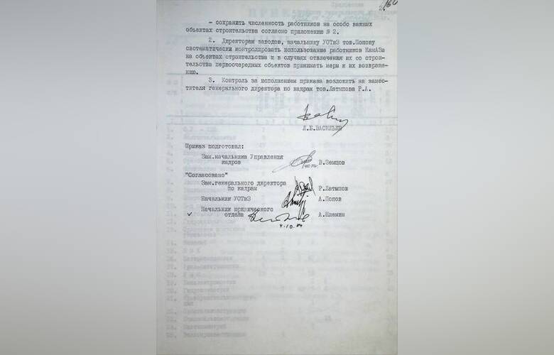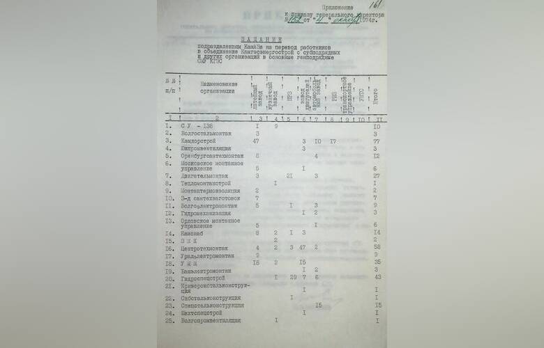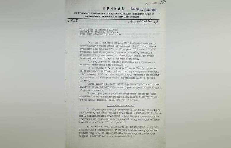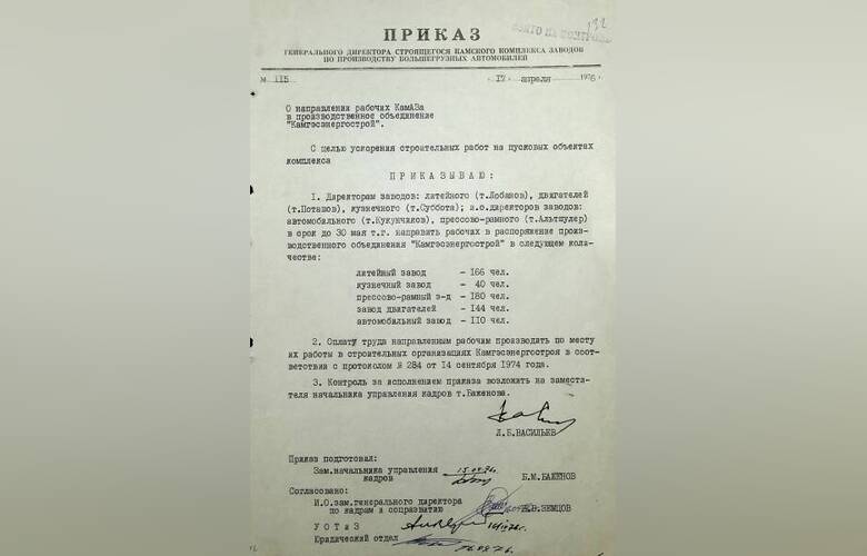 В приказе №152 от 4 октября 1974 года вы можете познакомиться с перечнем строительных организаций, в которые направлялись работники КАМАЗа.