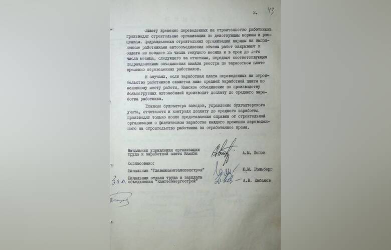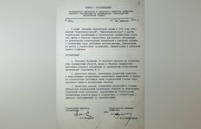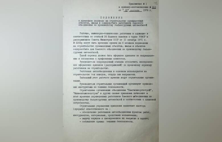 И, наконец, в приказе-постановлении №252 от 21 августа 1976 года вы можете познакомиться с Положением о временном переводе камазовцев на строительство промышленных объектов, жилья и соцкультбыта.
