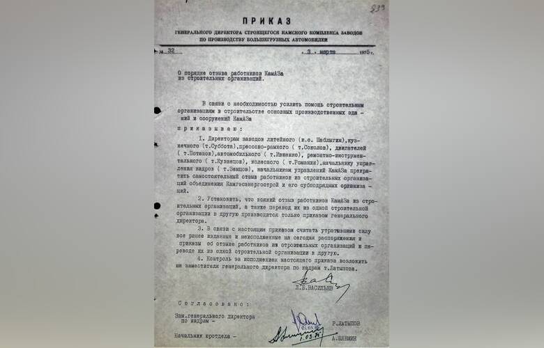 В конце 1974 года – начале 1975 года привлечение камазовцев на стройку приняло такие размеры, что в этот процесс вмешался сам Васильев Лев Борисович – генеральный директор КАМАЗа (1969-1981). Прочтите приказ №32 от 3 марта 1974 года.