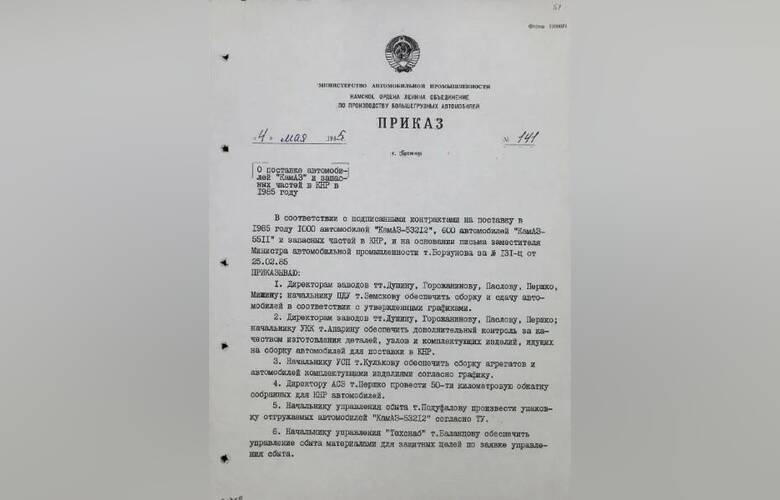 В 1985 году была сделана первая поставка автомобилей КАМАЗ в Китай. Об этом говорится в приказе генерального директора КАМАЗа №141 от 4 мая 1985 года.