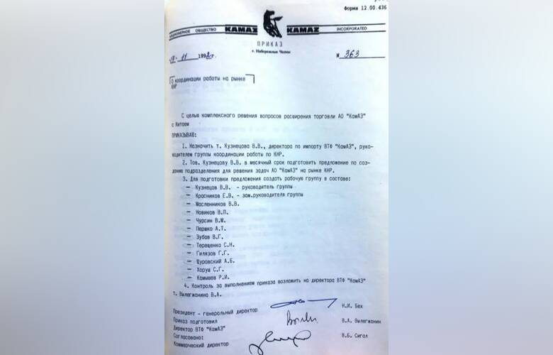 Для координации работы на китайском рынке на КАМАЗе была создана специальная группа во главе с Кузнецовым Владимиром Васильевичем. С полным составом группы вы можете познакомиться в приказе №363 от 17 ноября 1992 года.
