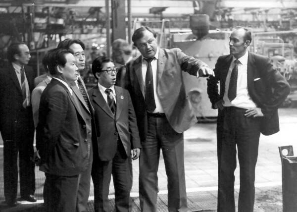 Экскурсию проводит Бех Николай Иванович – директор литейного завода (1980-1984), первый справа Дотолев Николай Иванович – начальник цеха производства цветного литья (1981-1988).