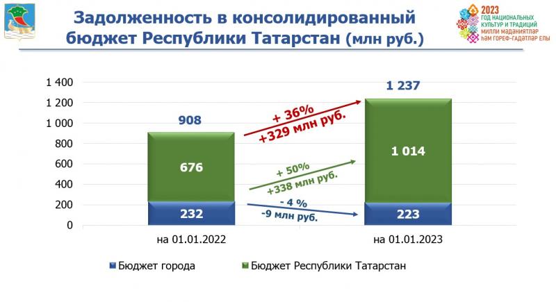 Мулюкова подчеркнула, что в общем долге, равном 1,24 млрд рублей, доля муниципалитета составляет 223 миллиона (18%) и за год она снизилась на 9 млн рублей – рост долга приходится на платежи в бюджет республики. Хотя за прошлый год город в целом погасил 1,5 миллиарда, из них 274 миллиона – за счет воспитательных бесед с тысячами налогоплательщиков, все равно общая задолженность выросла на 329 млн рублей (36%).
