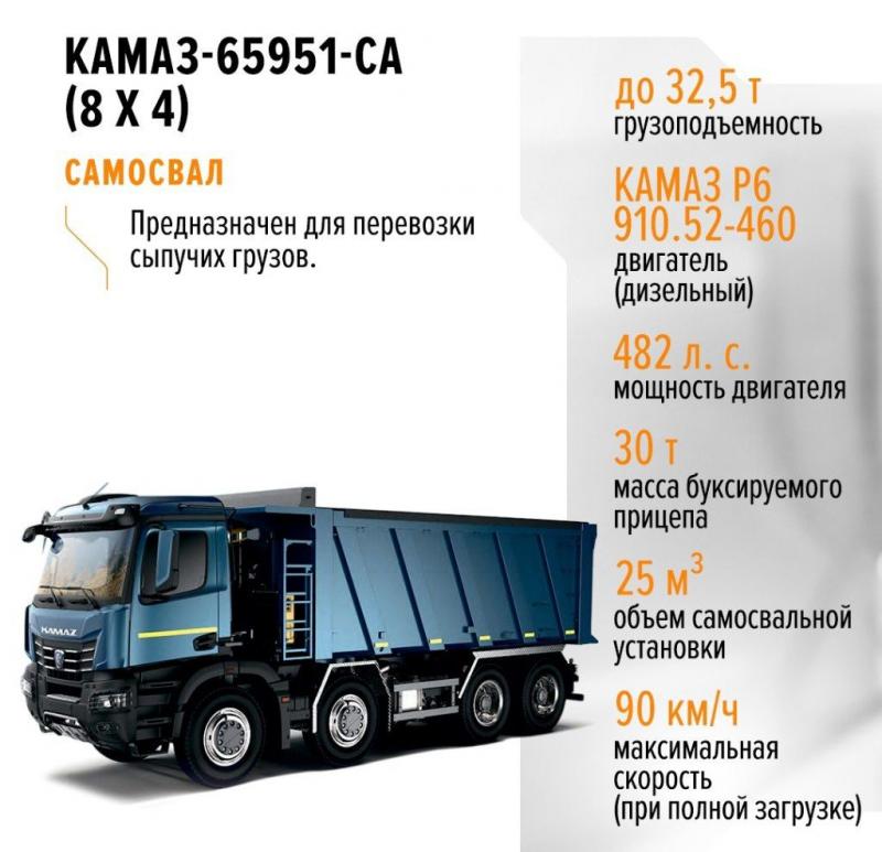 Помимо нового тягача, "КАМАЗ" презентовал обновление четырехосного самосвала КАМАЗ-65951-СА. Машина для разработки карьеров получила усиленные ведущие мосты и раму, а также кабину поколения К5 на четырехточечной подвеске. Кроме того, автомобиль оборудован системой обогрева самосвальной платформы выхлопными газами.