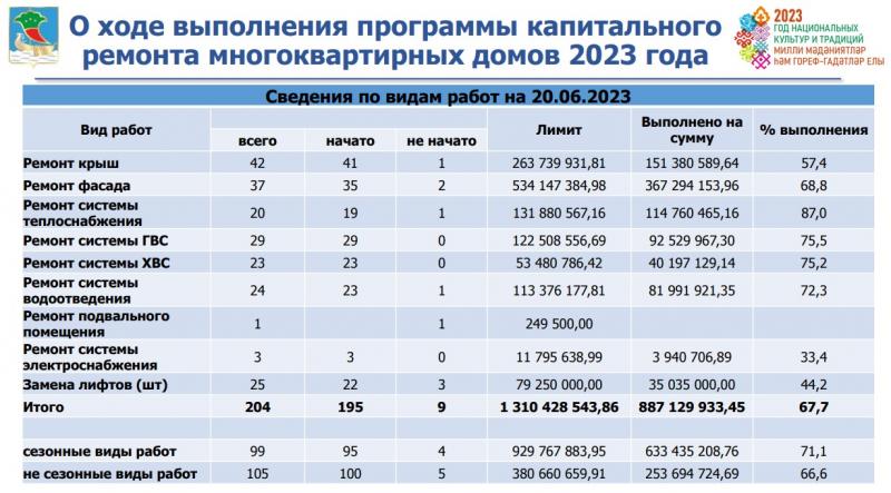 Капитальный ремонт жилых домов в Набережных Челнах на данный момент выполнен на 67,7%. За последние 15 лет было отремонтировано почти 2,5 тысячи домов на общую сумму 17 млрд рублей.
