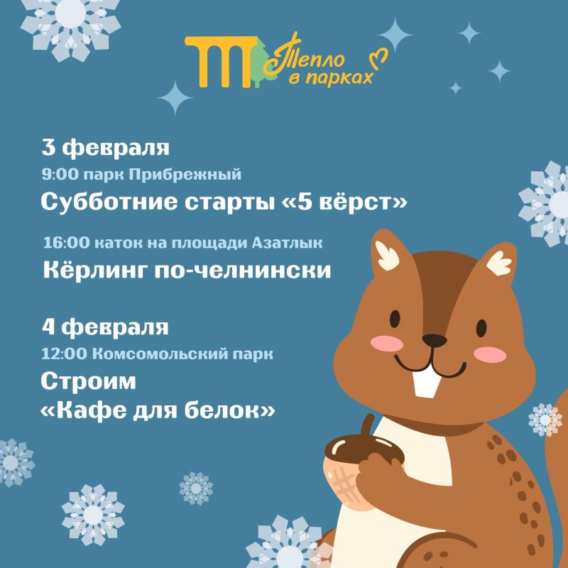 В 12.00 4 февраля команда «Парки Челнов» приглашает желающих построить вместе «Кафе для белок» - сооружения для пушистых зверьков, где гости Комсомольского парка смогут оставлять для них угощения, не загрязняя природу. Ссылка на регистрацию: https://forms.gle/8jJ27uFPvskttCVq6
