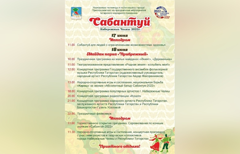В Набережных Челнах 18 июня состоится национальный татарский праздник «Сабантуй-2022». Как рассказал на совещании в мэрии города замруководителя исполкома Рамиль Халимов, уже началась подготовка к мероприятию. В этом году гостей праздника порадует обновленная «Деревенька». Оформление главного дома рассчитывается выполнить в стилизации «Татарская изба начала XIX века» с выставкой сундуков, самоваров и изделий ручной работы.