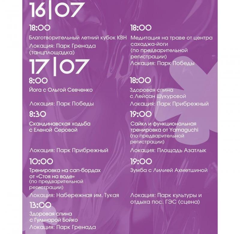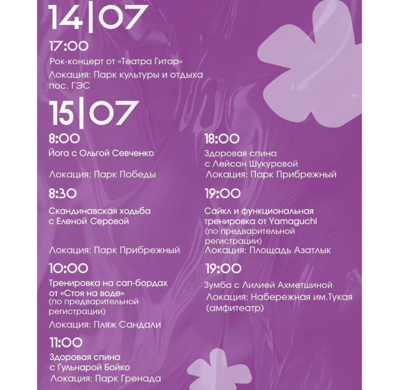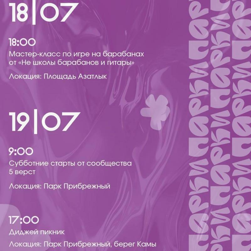 Команда «Парки Челнов» опубликовала афишу мероприятий на открытом воздухе, которые пройдут с 14 по 19 июля. На этой неделе жители и гости города смогут посетить спортивные тренировки, рок-концерт «Театр гитар», благотворительный летний кубок КВН, мастер-класс по игре на барабанах и диджей пикник.