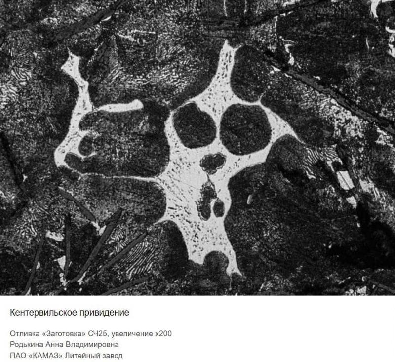 Удивительную структуру Анна Владимировна обнаружила на отливке серого чугуна при 200-кратном увеличении. Позже из этой заготовки получился толкатель клапана для двигателя внутреннего сгорания. «Сначала работу назвали «Привидение освещает свой путь в сказочный мир микроструктуры, – рассказала Родькина "Вестям КАМАЗа". – Затем рисунок увидела специалист из центральной заводской лаборатории Марина Филимонова и сразу опознала в нем Кентервильское привидение – так появилось креативное название».