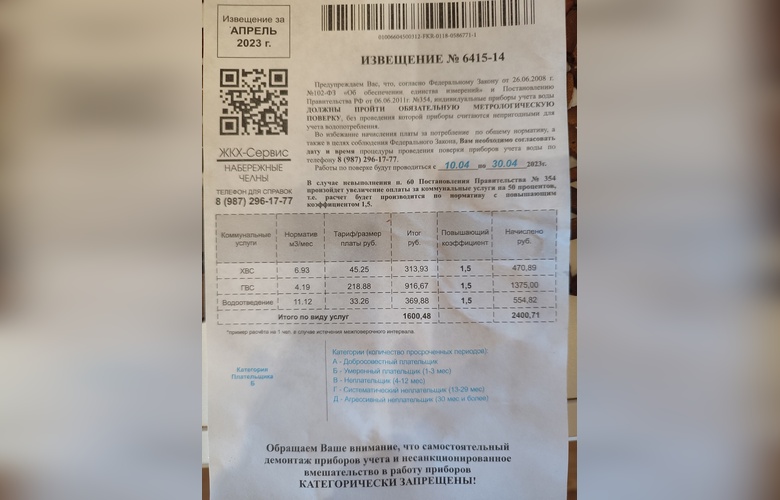 В листовке предлагается согласовать дату и время проверки по указанному номеру телефона. В случае невыполнения требования о проверке авторы угрожают увеличением стоимости водоснабжения и водоотведения в 1,5 раза, ссылаясь на постановление правительства. Тут же приведена таблица с расчетом долга за пользование горячей и холодной водой, а также канализацией.